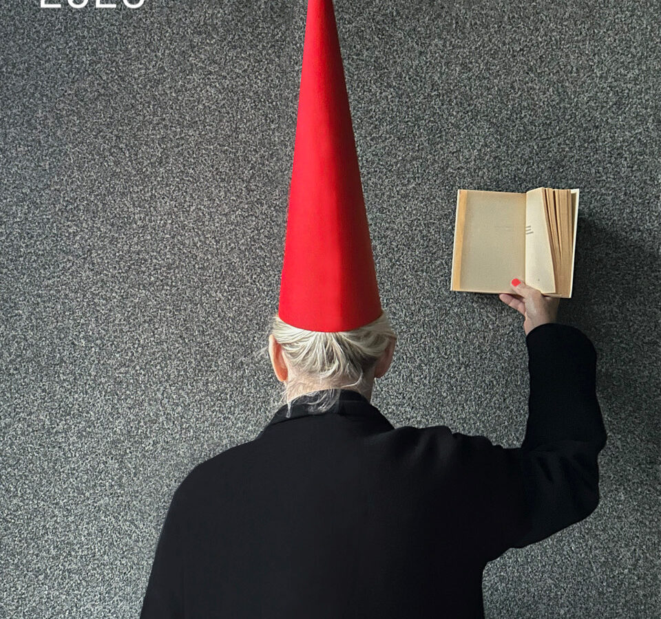 Here, Hilde Peleman once again gives her interpretation of a well-known image from art or architectural history: the well-known portrait of Charlotte Perriand, a pioneer in the field of design and architecture. Instead of skating, Hilde wears vintage shoes from Salvatore Ferragamo, the snowy mountain landscape has been replaced by a well-stocked library. Our New Year’s wish for 2024: Don’t look back, you’re not going that way.
