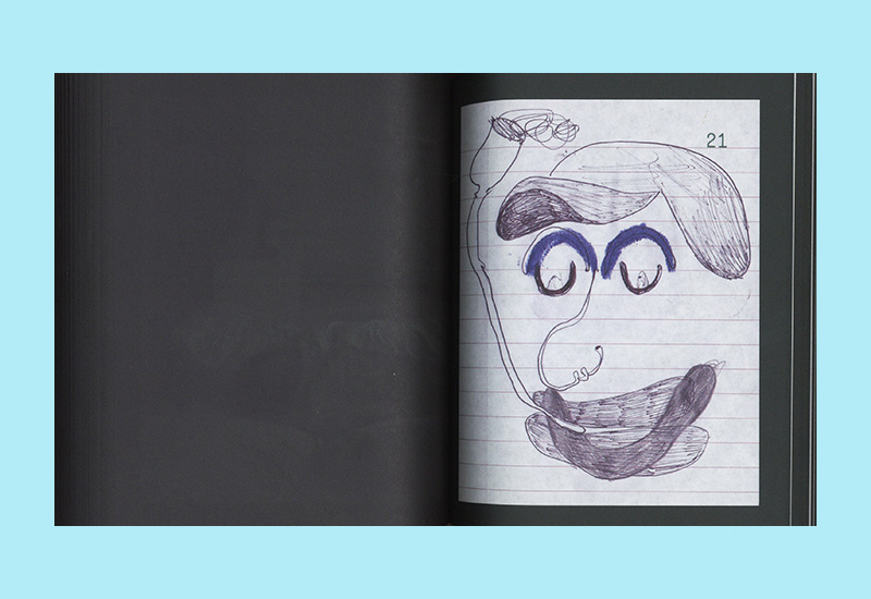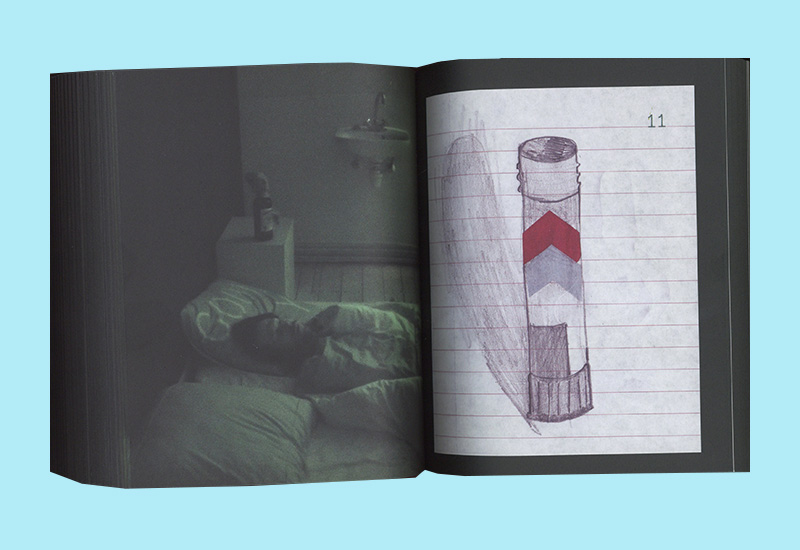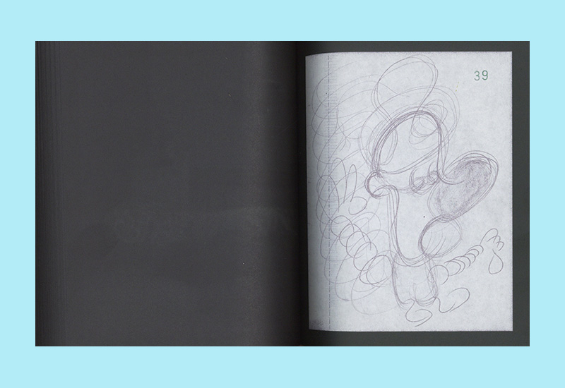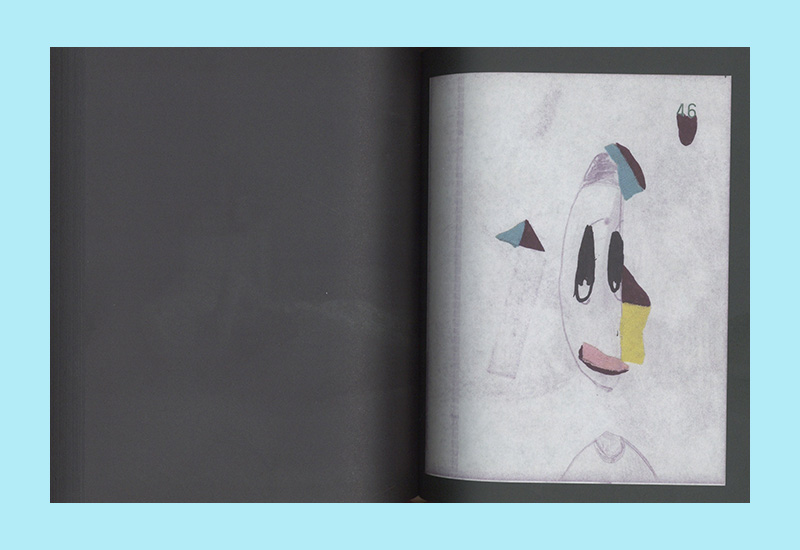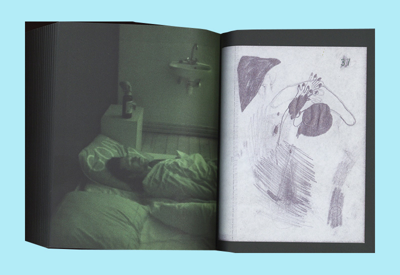 This hefty artist’s publication contains exclusively images by Antwerp artists Nel Aerts and Vaast Colson. Nel Aerts fills the right-hand pages with reproductions of five sketchbooks. The images show quickly created drawings and collages, sometimes abstract, sometimes figurative. Here and there she uses carbon paper, allowing the drawing to also appear on the back page. With this separation, she then continues working. The five sketchbooks are dated from September 11 to October 24, 2010. Meanwhile, greenish photos, taken from a fixed camera angle, appear on all the left-hand pages, showing Vaast Colson sleeping and then waking. The photos are initially dark, with little detail, but gradually brighten until The Master awakens. Intriguing in this artist’s book are the two different speeds evoked by the same page sequence.