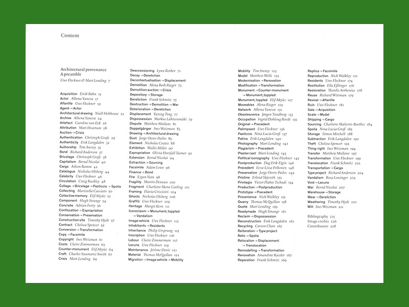 Provenance in Architecture. A Dictionary examines architectural provenance across 101 key concepts from “Acquisition” to “Will”, contributed by sixty brilliant writers. The entries provide new ways of writing architectural history, highlighting how architecture moves, is destroyed, survives and is transformed.