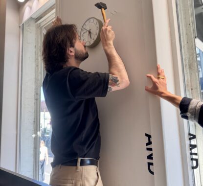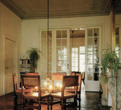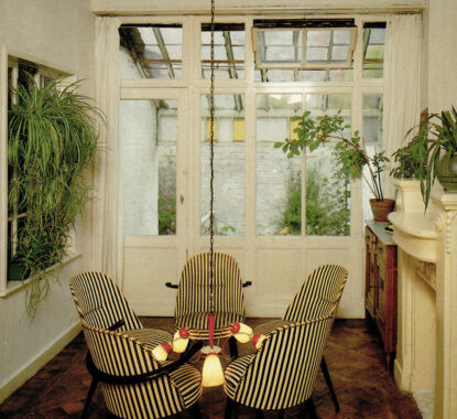 Na meer dan 15 jaar besloten we om de klok en hamer van Frans kunstenaar Jean-Luc Vilmouth opnieuw op te hangen. Het vormt een belangrijk accent in Copyright en is vooral voor Hilde en Johan een herinnering aan de tentoonstelling Chambres d’amis van Jan Hoet in 1986. Hun toenmalig appartement op de Coupure in Gent zat ook in het circuit en Jean-Luc Vilmouth maakte er een installatie in drie doorlopende kamers.