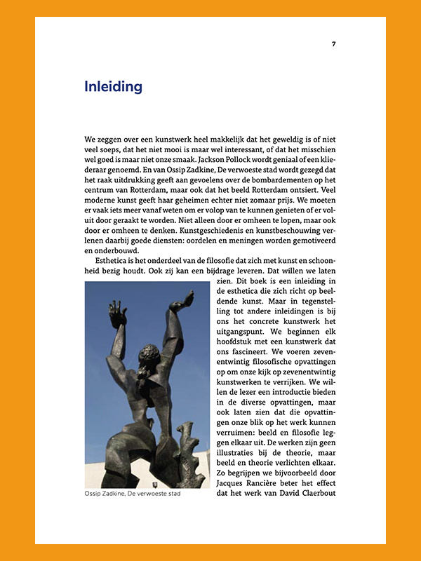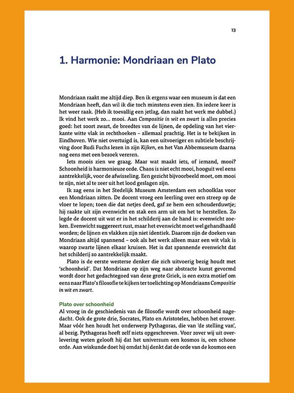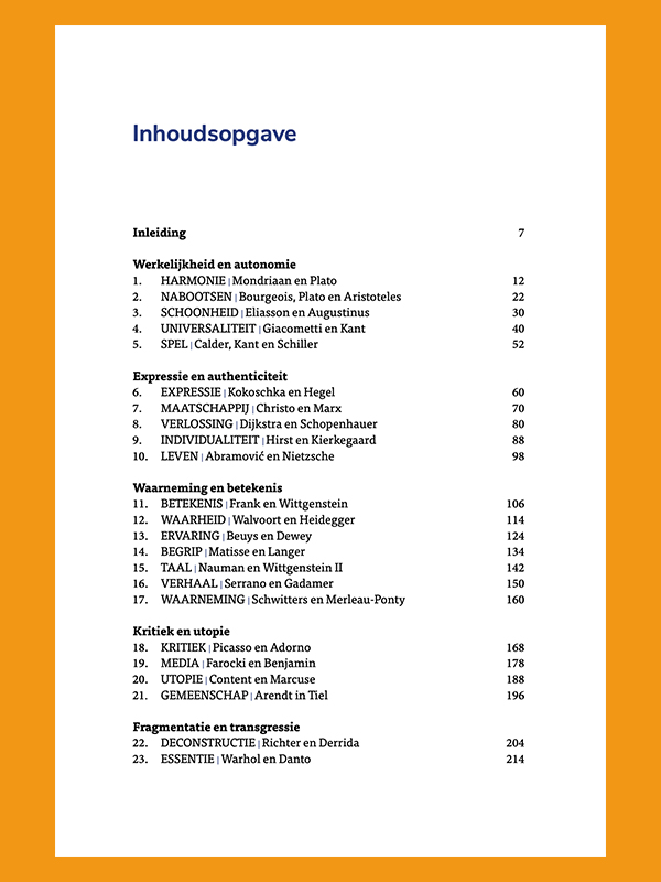 In zevenentwintig beknopte hoofdstukken laten de auteurs vanuit hun fascinatie voor een kunstwerk een filosoof meedenken over de betekenis van het werk. In elk hoofdstuk ontstaat een dialoog tussen een kunstwerk en een filosoof over kijken, betekenis en vorm: van Plato en Aristoteles tot en met Arendt en Haraway, en van Mondriaan en Picasso tot Warhol en community art. Het is verrassend om te zien hoe een kunstwerk een relatie aangaat met een filosofische theorie en andersom.