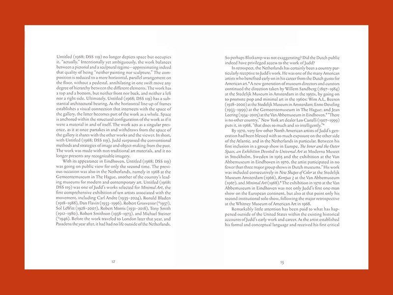 Richly annotated and lavishly illustrated, Donald Judd: The Low Countries. 1966-1971 adds a welcome, geographically specific chapter to the established scholarship on Judd.