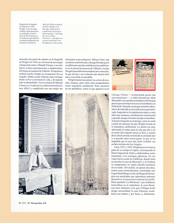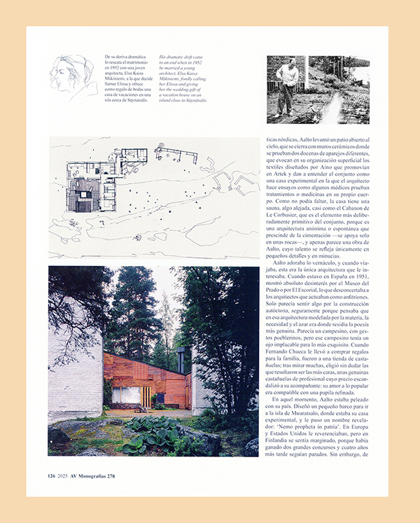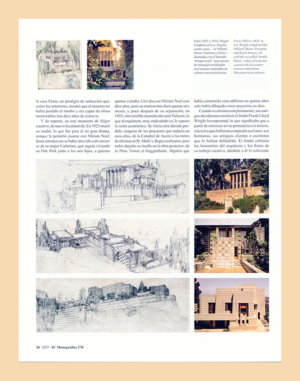 There’s no master without myth, so it is no surprise that the four most prominent modern architects, the most widely studied at schools, had novel-like lives: moments of genius, crises, stimulating friendships, great women by their sides… Luis Fernández-Galiano discusses all this in the new issue of AV Monographs, which examines the biographies of Frank Lloyd Wright, Mies van der Rohe, Le Corbusier, and Alvar Aalto. These life journeys originated in a series of lectures delivered in 2010 at the Fundación Juan March in Madrid, which had a great turnout and have continued to draw considerable attention ever since, thanks to streaming. As with ‘Four Cities’ (AV 259), this success with audiences has encouraged to document the talks in print, maintaining the natural pace and graphic profuseness of slide presentations.
