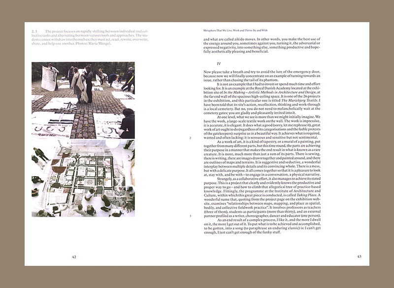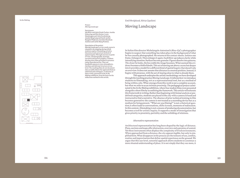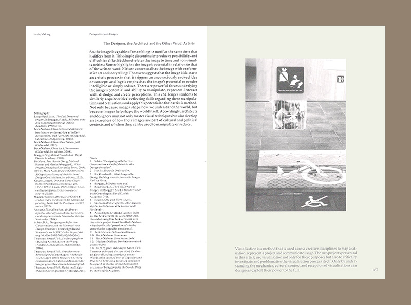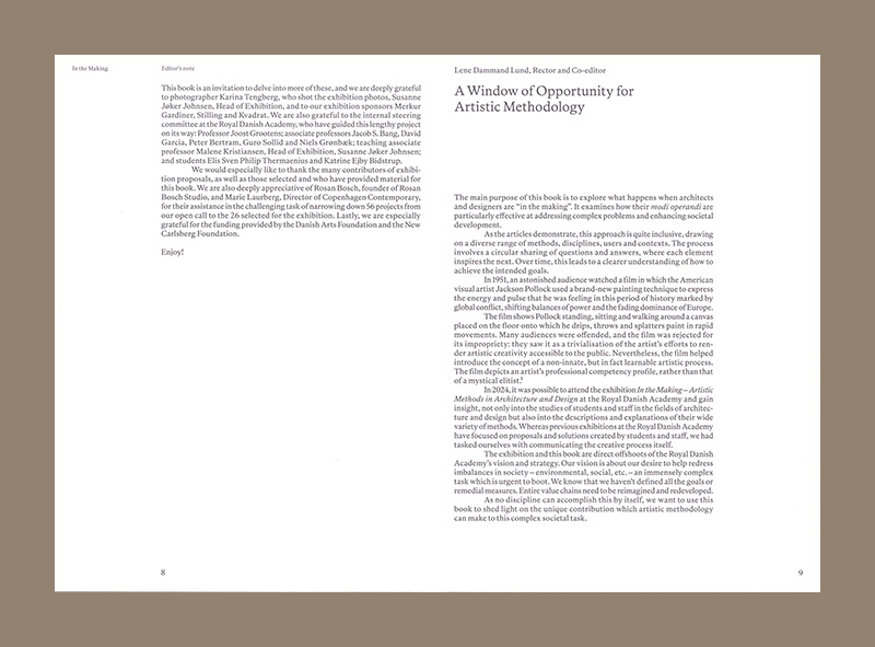 The book features twelve articles by writers, researchers and lecturers from Denmark and abroad. All of them relate to the exhibition Methods in Architecture and Design, held at the Royal Danish Academy in 2024 and 2025. The articles explore topics such as the language of materials, the art of drawing, context-based architecture in extreme environments, deconstructed graphic representation, topographic mapping as composition and design experiments.
