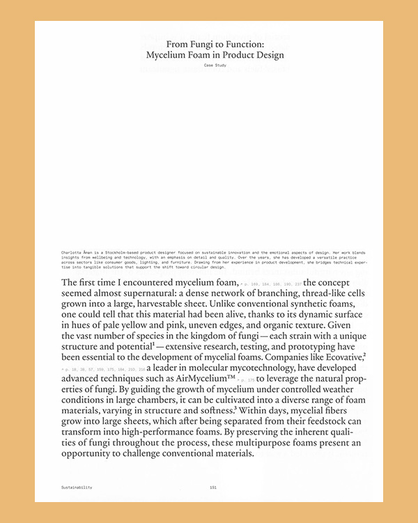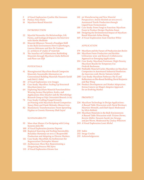 How can the mycelial structure of fungi transform architecture and design? This publication examines the potential of resource-efficient biomaterials, taking ecological and economic aspects into account and providing new impulses for material research and application. From building materials to textile applications, scientific insights, technological innovations, and practical implementations demonstrate the new perspectives mycelium, as a growing material, can offer. Essays, case studies, interviews, and visual contributions report on challenges, breakthroughs, and future opportunities – and on how renewable materials can be integrated into circular and sustainable design practices.