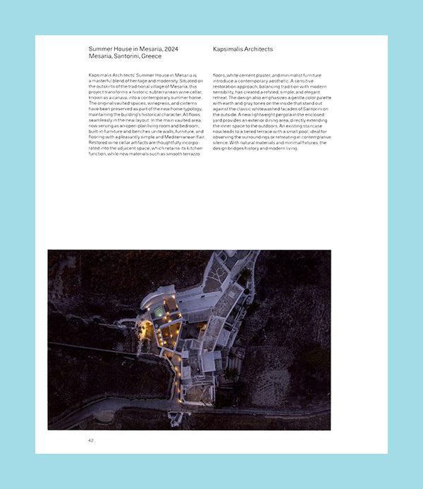 Featured architects include: Manuel Aires Mateus, Studio Arthur Casas, Tom Dixon, Steven Harris Architects, Adrian James Architects, Olson Kundig, LEVER Architecture, Studio mk27, NADAAA, Norm Architects, Atelier du Pont, Rees Roberts & Partners, Studio Saxe, Fran Silvestre Arquitectos, Walker Warner Architects, and Antonio Zaninovic.