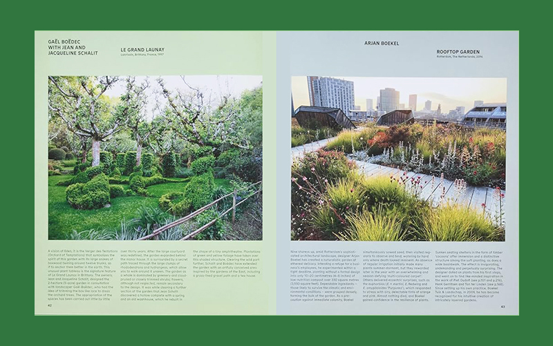 Garden designers featured include: Marian Boswell, Sam Cox, Erik Dhont, Isabel Duprat, Luciano Giubbilei, Olin, Piet Oudolf, Reed Hilderbrand, Amalia Robredo, and Tom Stuart-Smith