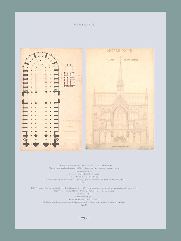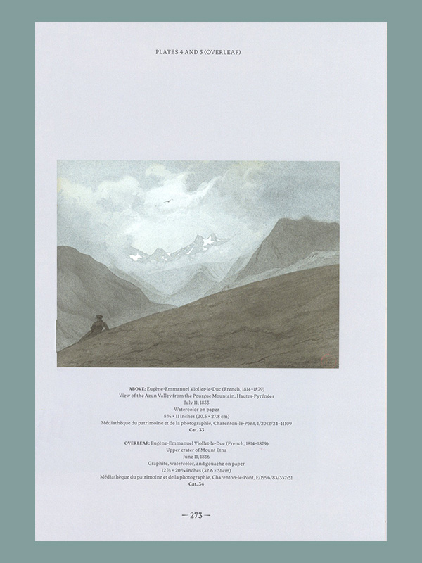 Making sense of Viollet-le-Duc’s vast graphic production, scholars consider his imaginative recreations of the most minute aspects of medieval warfare; his approach to the practical tasks of restoring very complex medieval monuments; his experiments in new means of publicly diffusing architectural ideas in the yearly Parisian salons, in didactic manuals, and in children’s books; and even a fantastic project to restitute the original structure of the formidable massif of Mont Blanc. The gamut of techniques employed by Viollet-le-Duc stretches from large painted tableaux to lithographs, steel engravings, woodcuts, gouaches, tracings, and full-scale details.